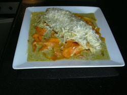 El pimentón y la cebolla se parten en julianas bien delgadas y se les echa un poco se sal y pimientas; se sofrien en aceite de oliva y se les incorpora la leche de coco. Se deja hervir por espacio de 5 minutos; luego se le echa esta salsa al salmon y se deja cocinar por espacio de 10 minutos a temperatura baja para que coja el sabor de la salsa.
