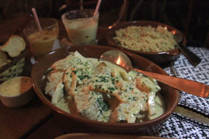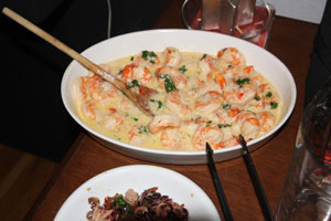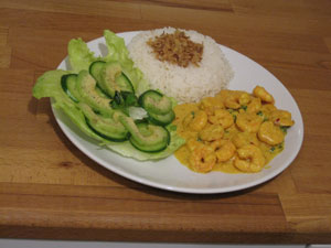 Se echa el ajo, el jengibre, la cebolla bien picada en la sartén con el aceite de girasol; luego se agregan los langostinos y se sazonan con sal, pimienta, unas gotas de limón, curry, 1/2 cucharadita de chili, la media lata de leche de coco, cilantro bien picado y se revuelve todo muy bien.